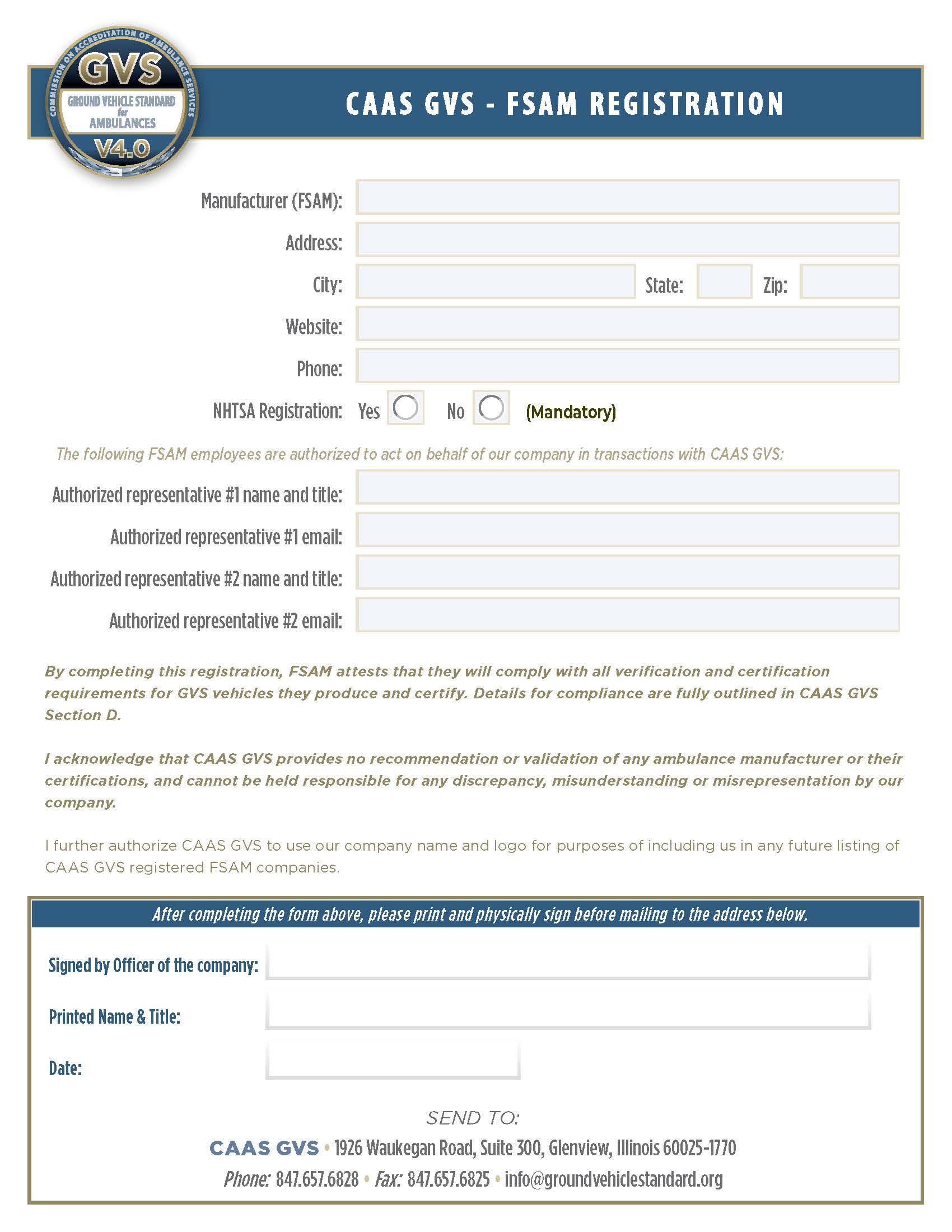 GVS V4.0 FSAM Registration FormFinal Stage Ambulance Manufacturers (FSAM) companies producing CAAS GVS V4.0 certified vehicles are required to register with CAAS GVS in order to obtain the GVS V4.0 certification stickers and verification documents required to certify these vehicles. Download GVS V4.0 FSAM Registration FormSize: 844 KB